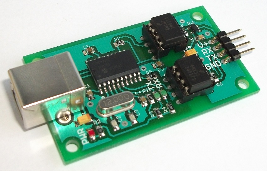 MCP2200 OPTO is a optically isolated USB-UART conveter. It is based on Microchip MCP2200 chip. There are two 6N137 optocouplers on the module for receive (RX) and transmit (TX) lines.
