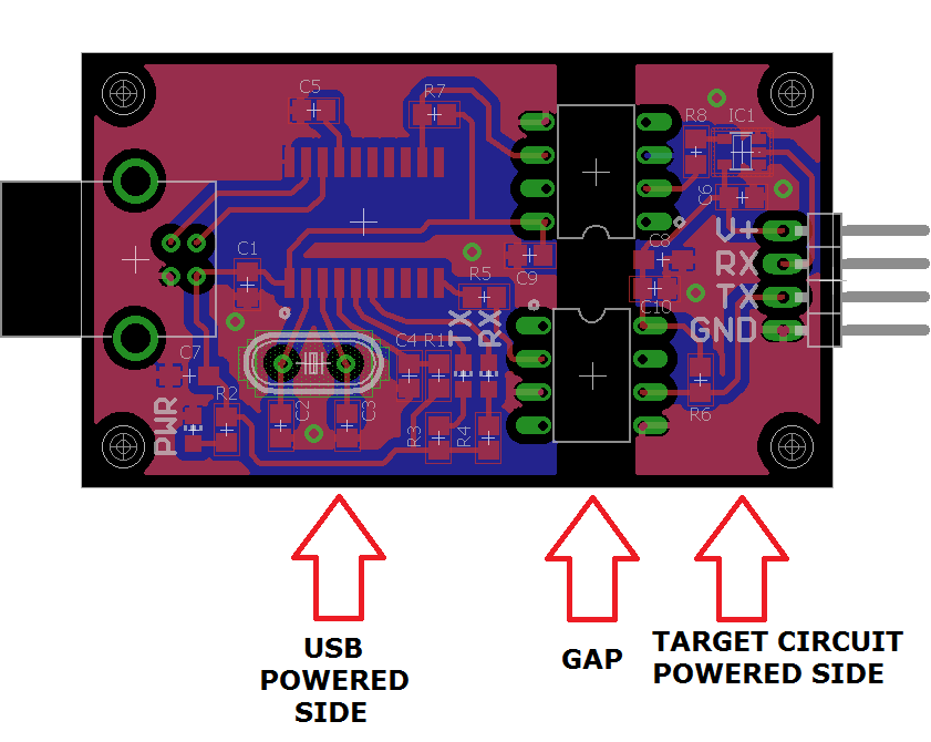 The module has a USB powered part and a target circuit powered part. The two parts are not galvanically connected. The target circuit MUST power the "target circuit powered side" part of this converter!