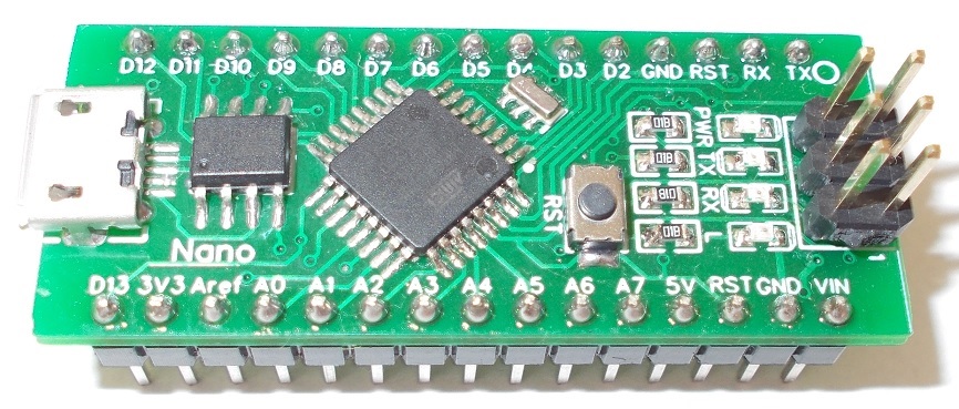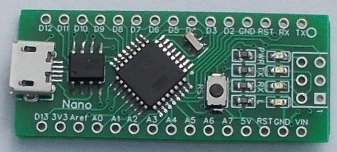 Nano is assembled with genuine ATMEGA328P microcontroller. Nano is compatible with Arduino Nano. If you need Nano compatible board running at 32MHz, see my LNano product.